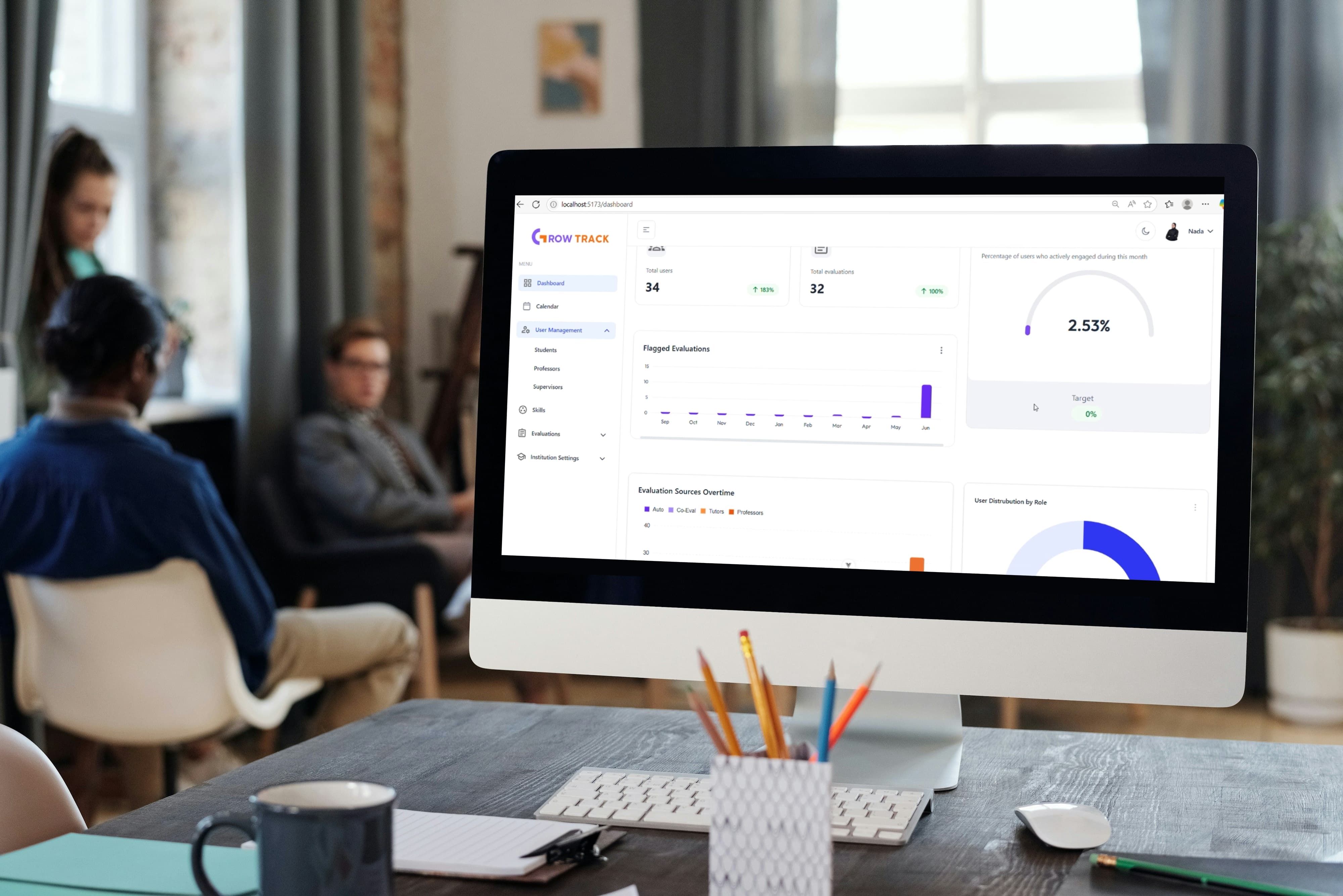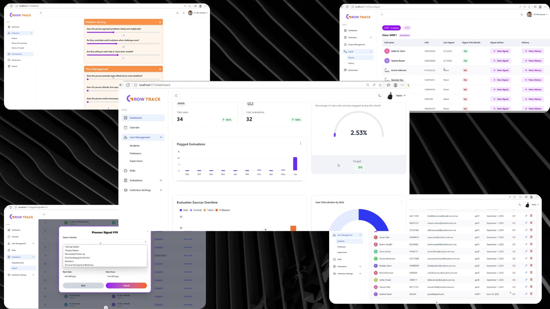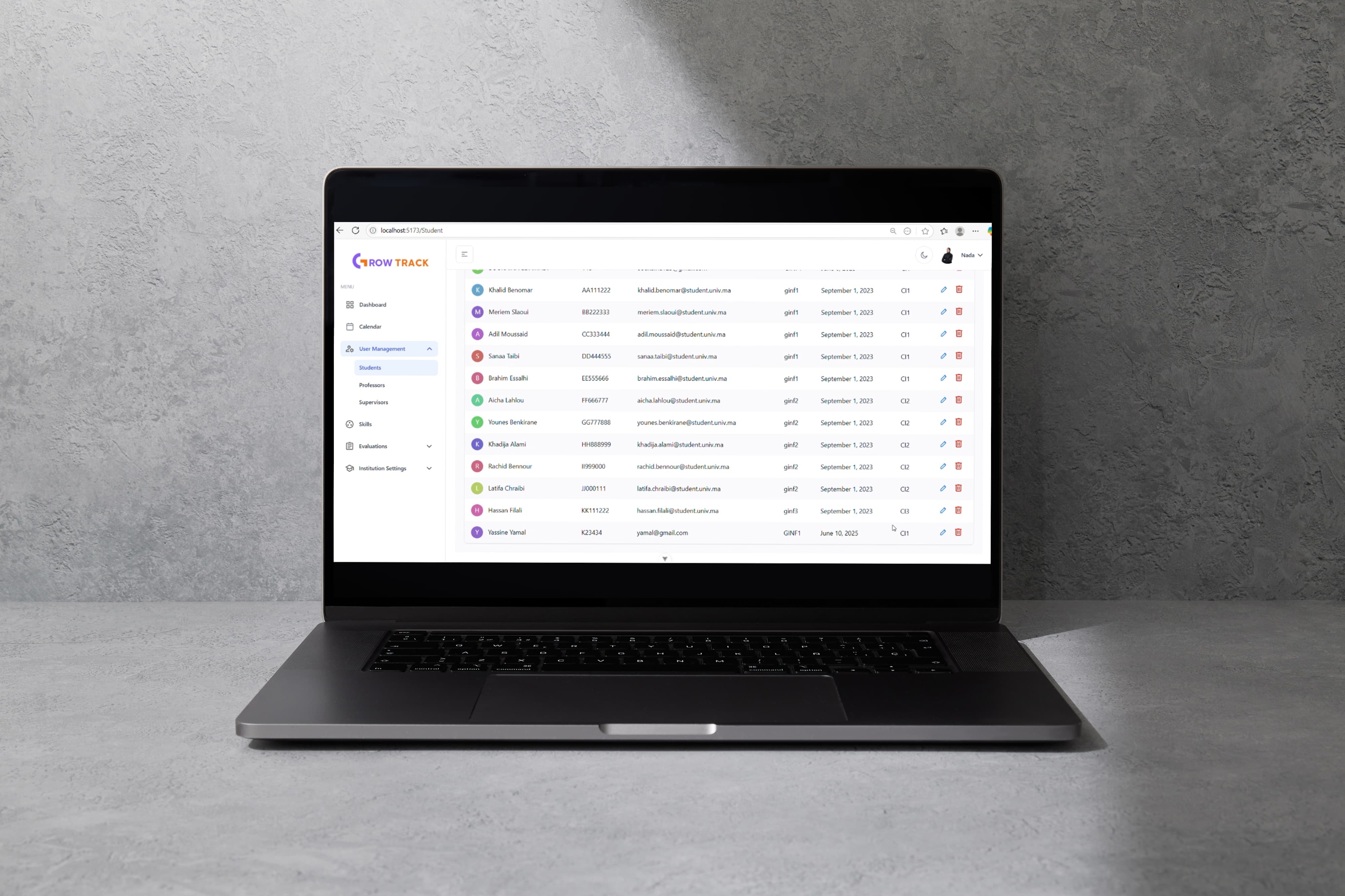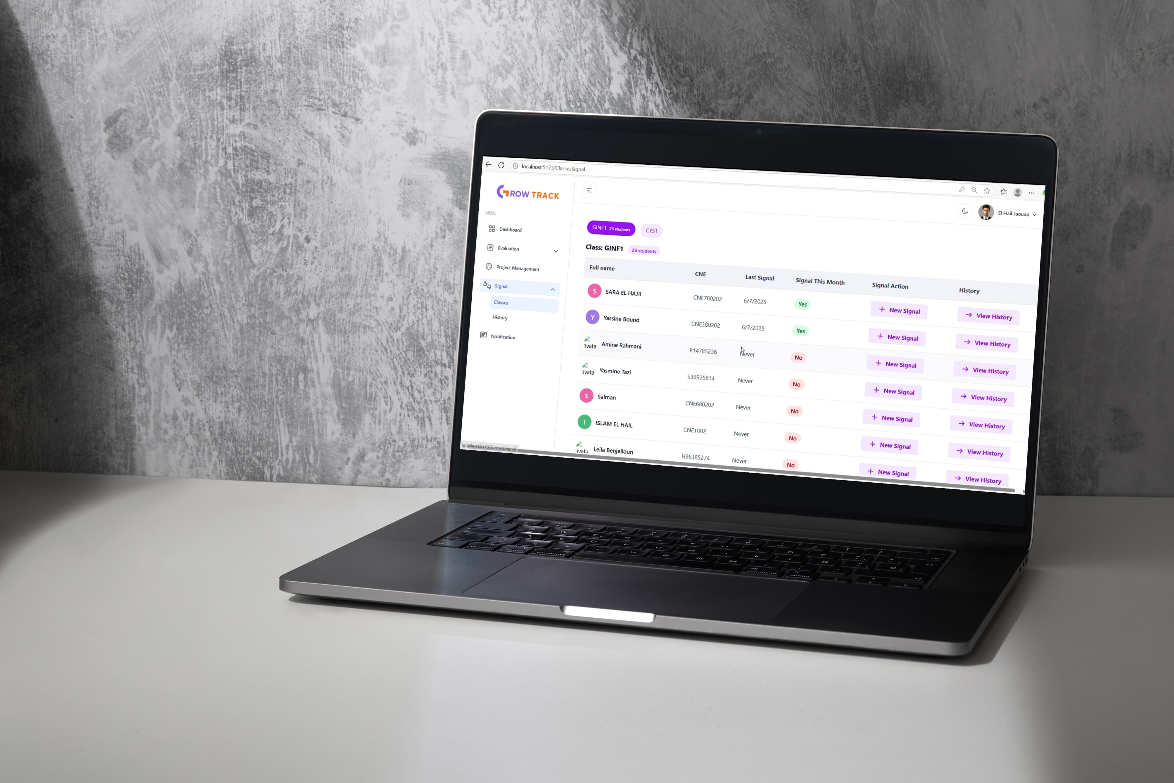 GrowTrack is a centralized web platform designed to transform academic tracking and skills development within higher education institutions (universities, engineering schools, training centers). The application replaces fragmented traditional methods (spreadsheets, paper) with a cohesive digital ecosystem where Administrators, Professors, and Students collaborate to ensure academic and professional success.