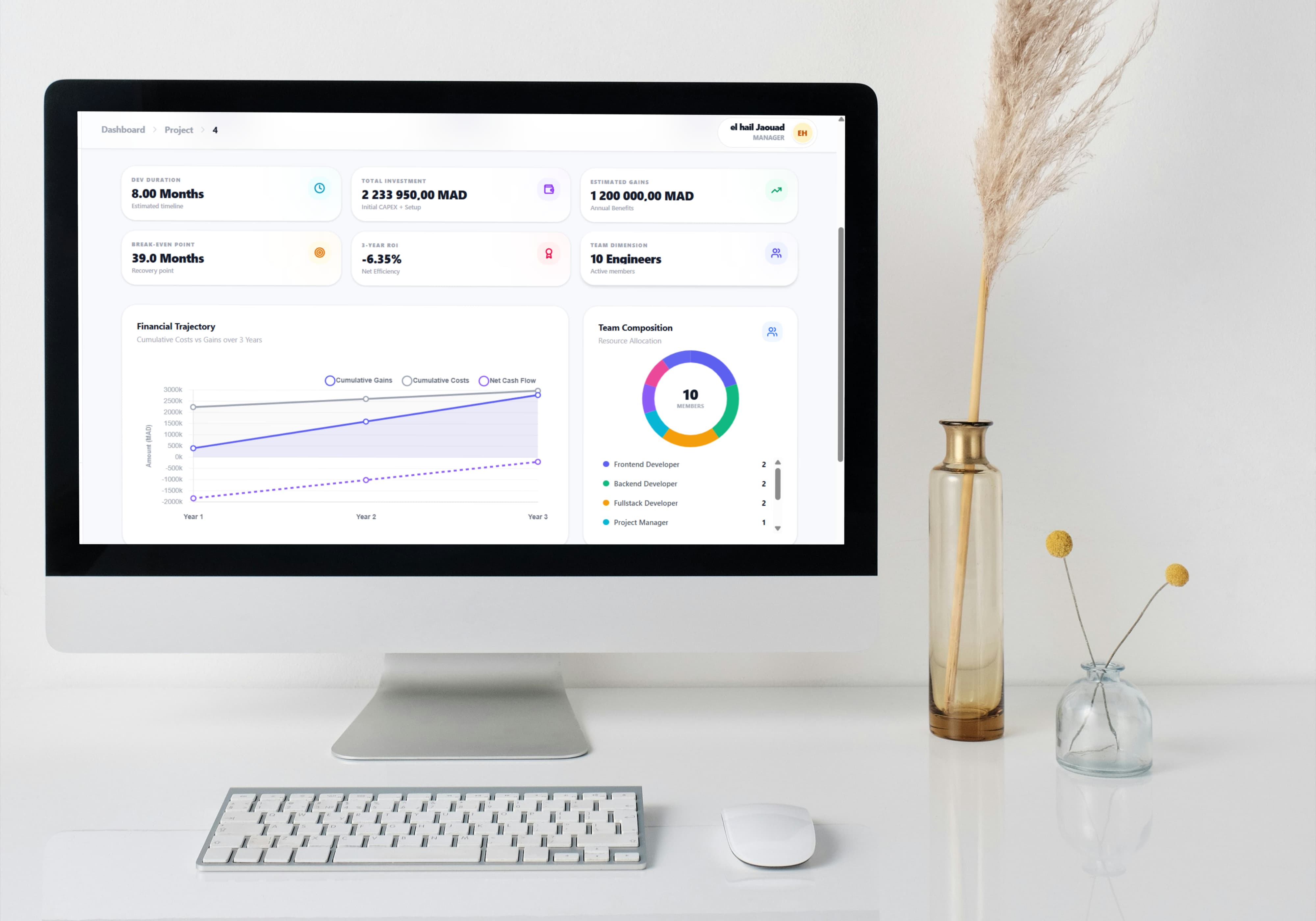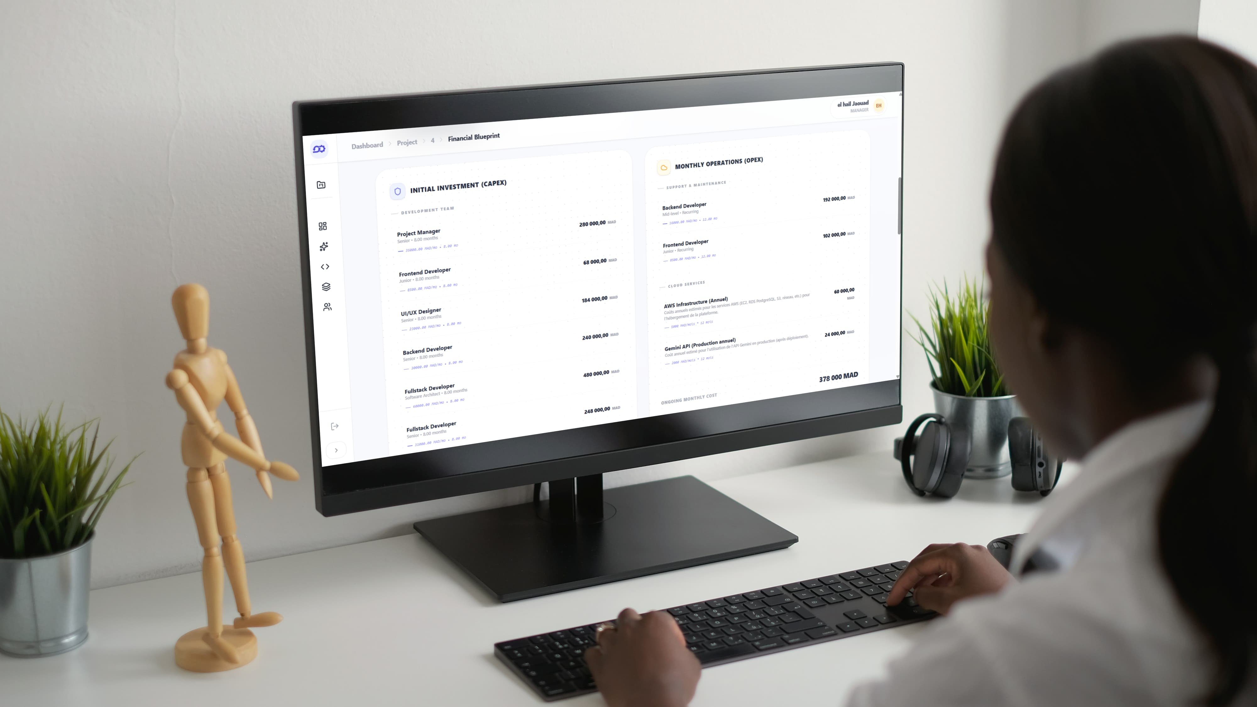 Automatic calculation of CAPEX/OPEX, 3-year projections, and break-even point identification.