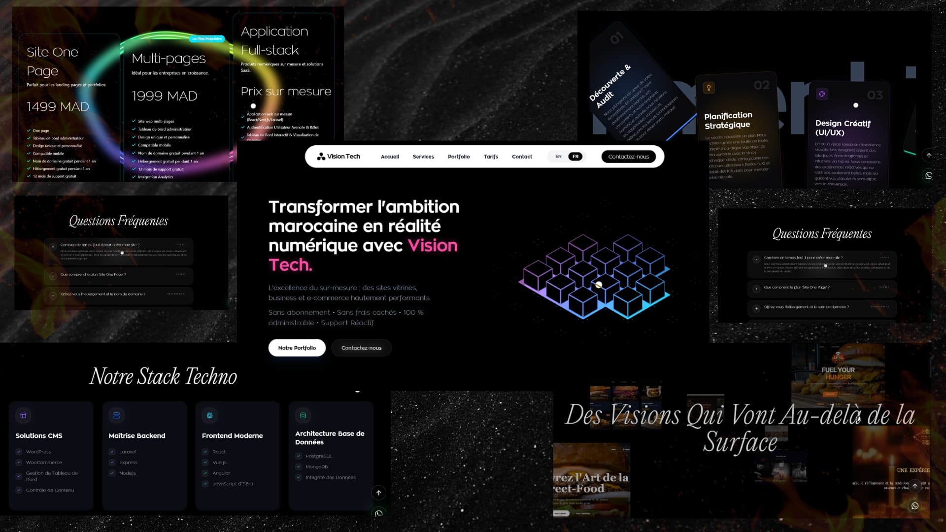 VisionTech is the immersive showcase of a Moroccan agency specializing in designing exceptional websites and digital products. Combining a sophisticated Dark Mode with cutting-edge technologies (3D, WebGL), the platform delivers ultra-smooth cinematic navigation powered by GSAP. Blending haute couture design with technical performance, it embodies local expertise in the service of premium digital innovation.